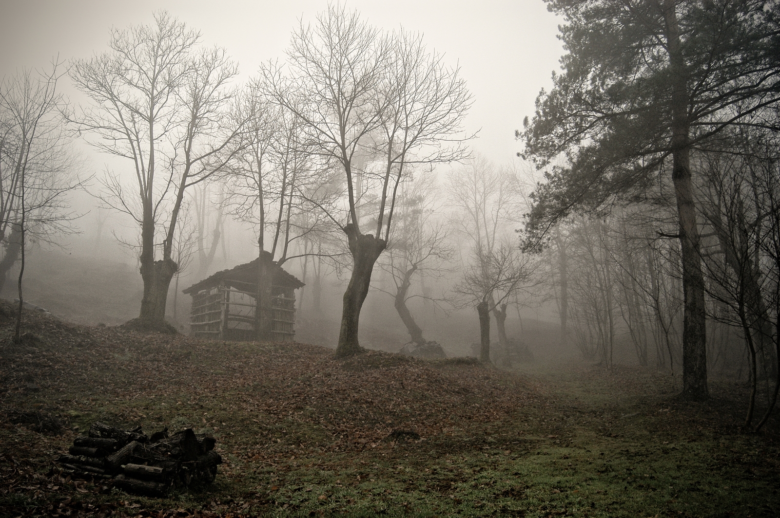 Le fotografie di questa sequenza odorano di foglie umide, la nebbia fumosa del primo mattino sembra palpabile e il ritmo con cui veniamo proiettati dentro a questo inseguimento è vorticoso, con continui spostamenti dal punto di vista del fotografo a quello destabilizzante del Buffardello: il magma di foglie morte e borraccina è un materasso in cui compiamo agili falcate, muovendoci lesti in mezzo ad alberi parlanti, che sembrano conoscere il nostro nome e sulla corteccia prendono vita volti e inquietudini.