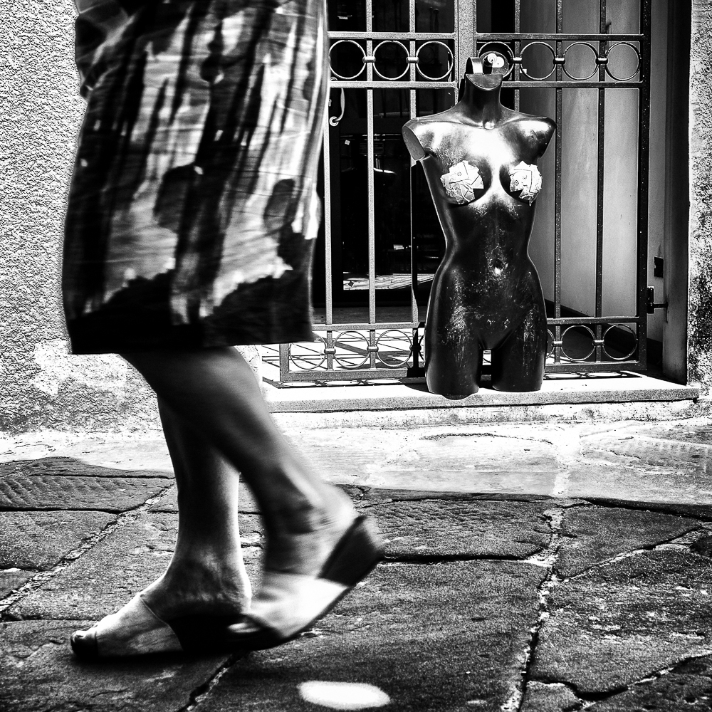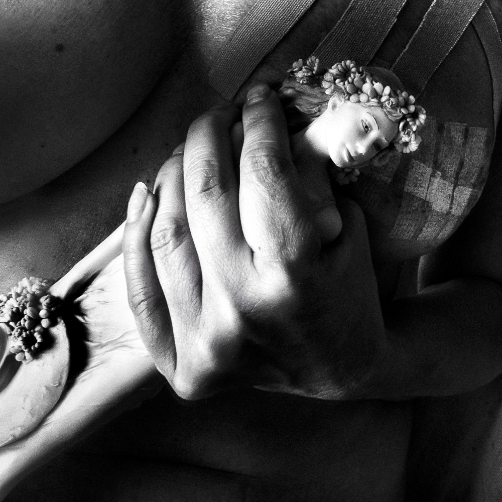 Qui un bianco e nero tutto sommato morbido, elegante, come il suo approccio all’immagine fotografica, rende omogeneo il flusso di pensieri apparentemente onirici e vagamente surrealisti, che passano davanti ai nostri occhi. Immagini che rimandano ai compagni di Breton, alla scrittura automatica, alla trasposizione di sogni lucidi su carta fotografica. Troviamo indizi di questo nell’uso consapevole di ogni superficie riflettente, concava, piatta, circolare e poi manichini, bambole e travestimenti, sovrapposizioni di significati e piani immaginari. Ma è solo una scelta di stile che serve a portarci “dentro”, per dare modo a queste allegorie di fermentare, diventando vino capace di bruciare le viscere.
